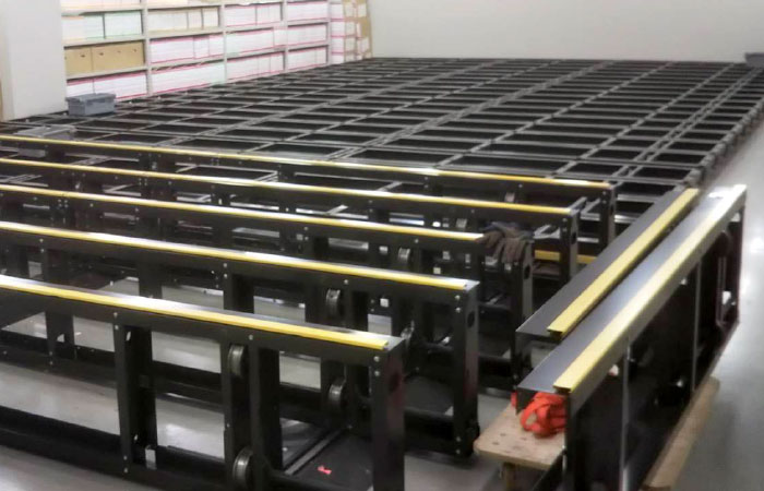 床面は完全にフラットで、納品車での通り抜けもスムーズに行えます。また固定ラックに比べると、同一スペースでの保管量は約2倍になり、人員や設備の重複、入出庫の手間など、さまざまなロスが削減され効率的な倉庫運営・管理が実現可能です。