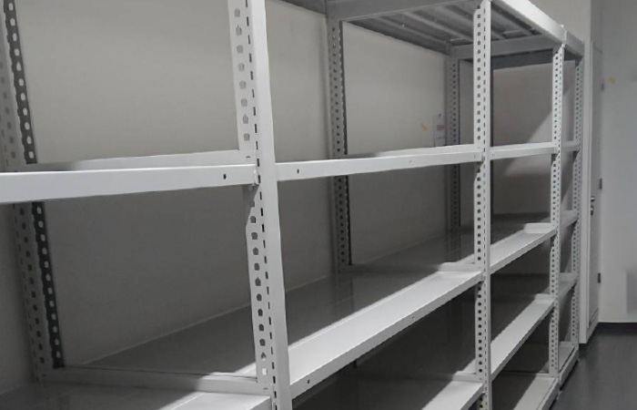 段ボールや小物を保管する中量系の固定棚。